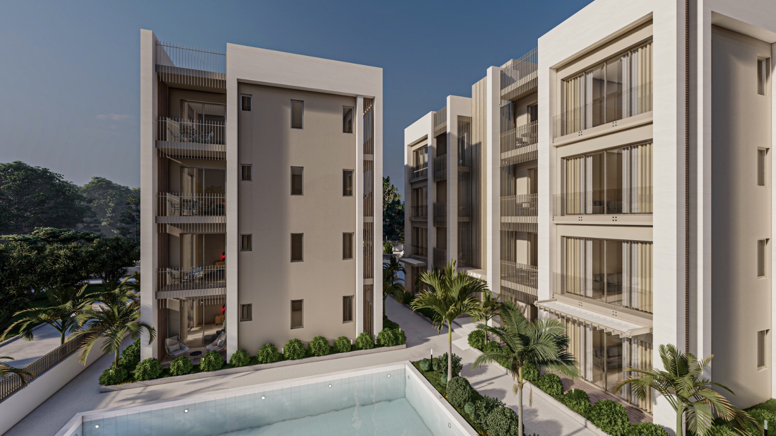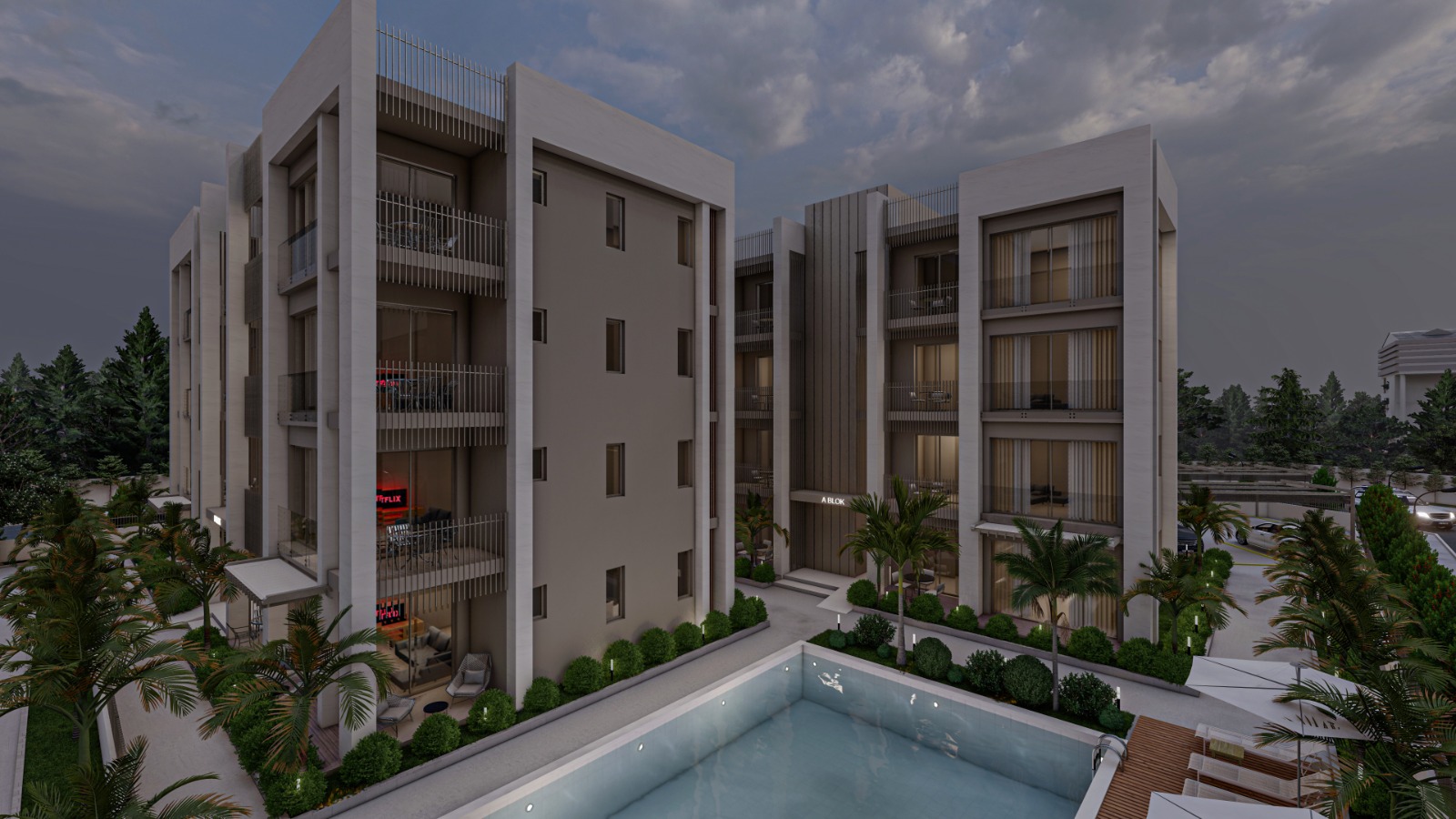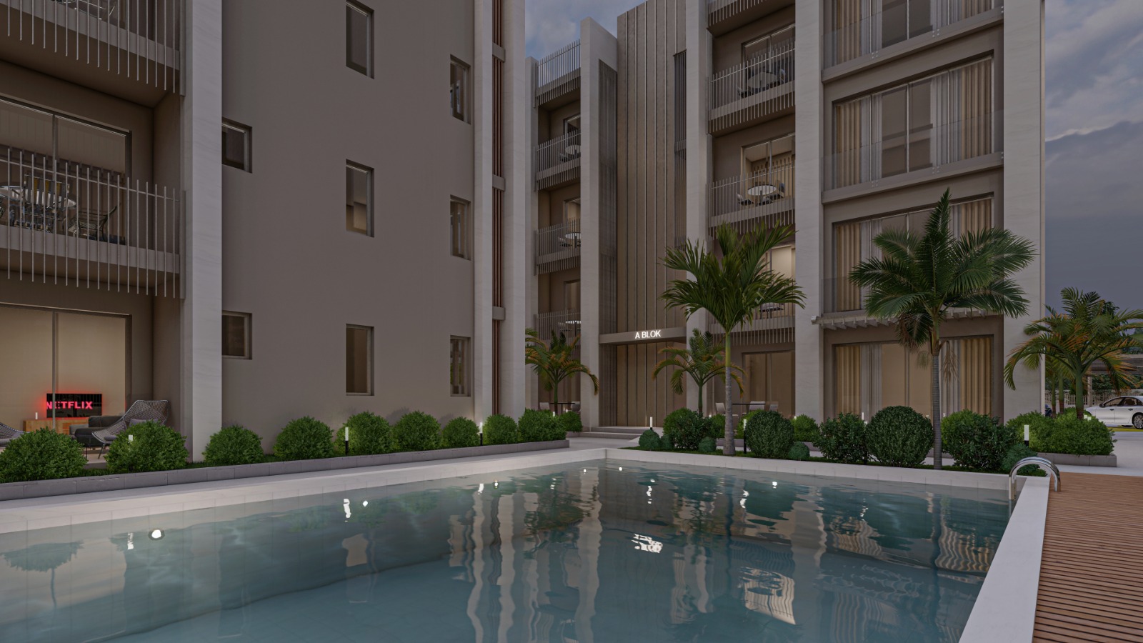 Aktivite alanına konumlandırılmış, doğa ve yeşil ile bütünleşmiş yüzme havuzu